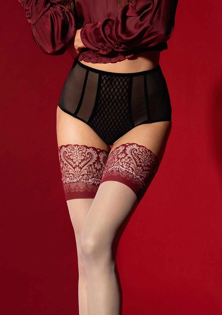 The mix of carmine exotic patterns on the lace of our hold-ups is like an oriental dance. Imagination makes fancy scarves Persian rugs and beautiful mosaics swirl in front of our eyes. The whole is exposed on a sand-light desert background. Let yourself be seduced by this story. Sensuous hold-ups with a sexy red lace top sheer leg and invisibly reinforced toe portion for elegance. Double covered yarns in 3D technology increase durability and resilience as well as guarantee soft and smooth texture – a ?silky touch? effect. This technology provides a feeling of comfort to your skin and increased elasticity for a perfect fit.The Fit:S (2) fits like S/MM (3) fits like M/LL (4) fits like L/XL