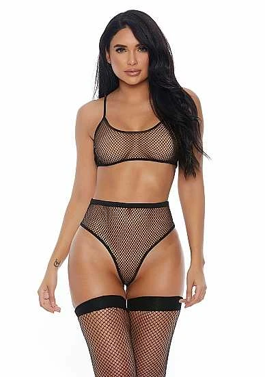 Caught Me Started tweedelig lingerie set van visnet bestaande uit een cami crop-top en high-waist slip met hoge uitsnede. De BH heeft verstelbare bandjes en een haak en oog sluiting aan de achterkant. Dit product wordt geleverd in een doosje.