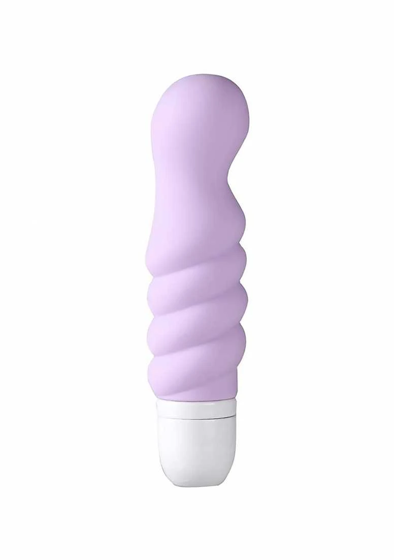 Maia Toys Chloe Silicone G-Spot Lavender Vibrator. Silicone twisty curved non-phallic shaft. Swirled pattern throughout with 15 vibrating pulsations. Waterproof vibrations. Vibrator requires 1 AA battery not included.
