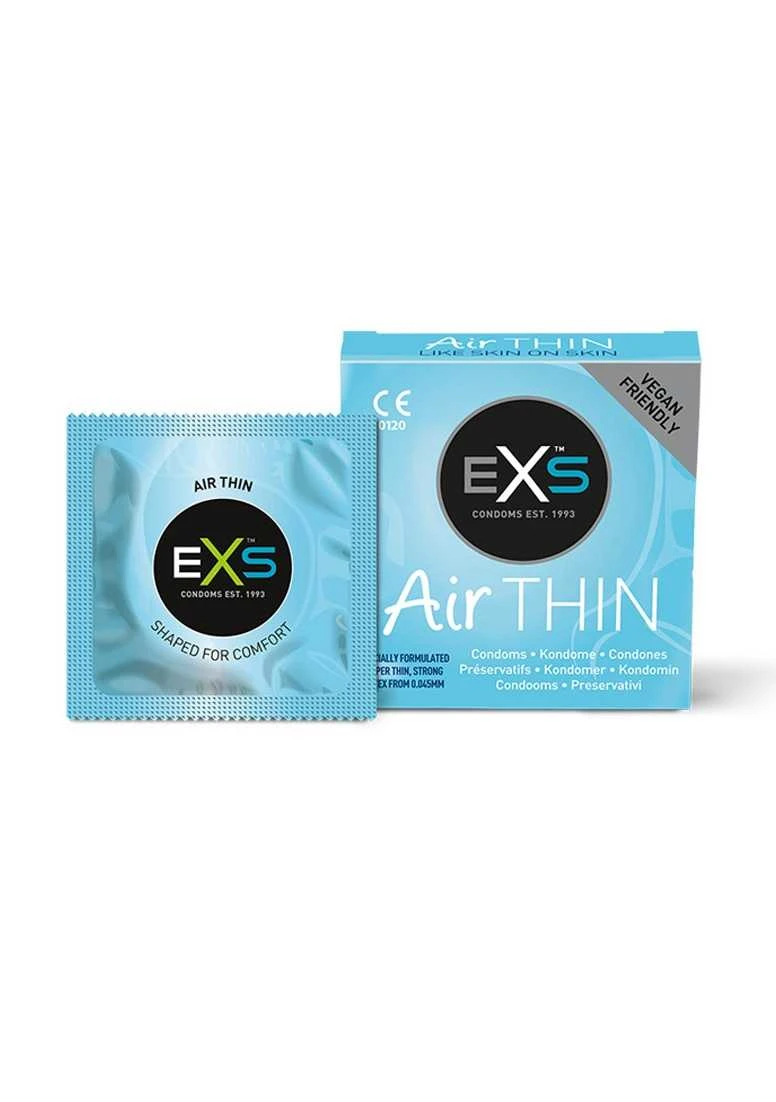 EXS Air Thin condoms pack of 3 contains 3 Air Thin condoms 56mm width and 0.04-0.045mm thick – one of the thinnest condoms in the world