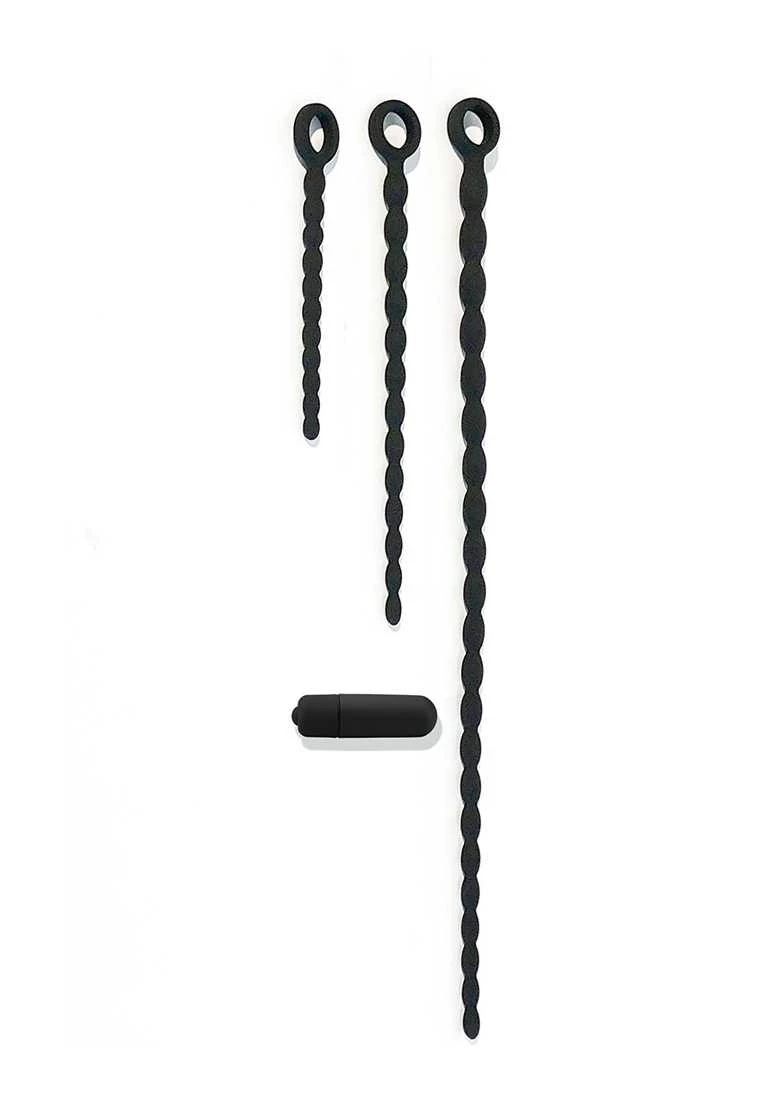 Vibrating Sounds is a sounding kit for the beginner to the advanced enthusiast. The kit includes three silicone sounding rods in graduated lengths and thicknesses. The beaded flexible sounds bend with the body to make it easier to go deeper and hit your prostate. The beaded design allows lubricant to stay between the beads as you insert them to make it easier to slide in without re-lubricating so often.The kit also includes an interchangeable 7-speed vibrating bullet with 7 different strengths and patterns that travel down the entire length of each sound. When inserted through the circular opening on the top of each sound the bullet also acts as a handle to easily guide each sound while inserting for that unique prostate sensation that you crave.Made of premium medical grade silicone. These urethral sounds are easy to sterilize and body safe for an all new sounding experience.Soft Touch Silicone3 Graduated SizesIntense StimulationSuper FlexibleStimulates ProstateSmallLength: 5.5 (14cm)Largest Width: .35 (9mm)MediumLength: 8.7 (22cm)Largest Width: .39 (10cm)LargeLength: 16.1 (41cm)Largest Diameter: .47 (12mm)This product is safe with all lubricants completely hypoallergenic non-irritating and compatible with sensitive skin. Care Instructions:Wash thoroughly with mild soap and warm water or toy cleaner. Pat dry and allow product to completely air dry. Store separately.
