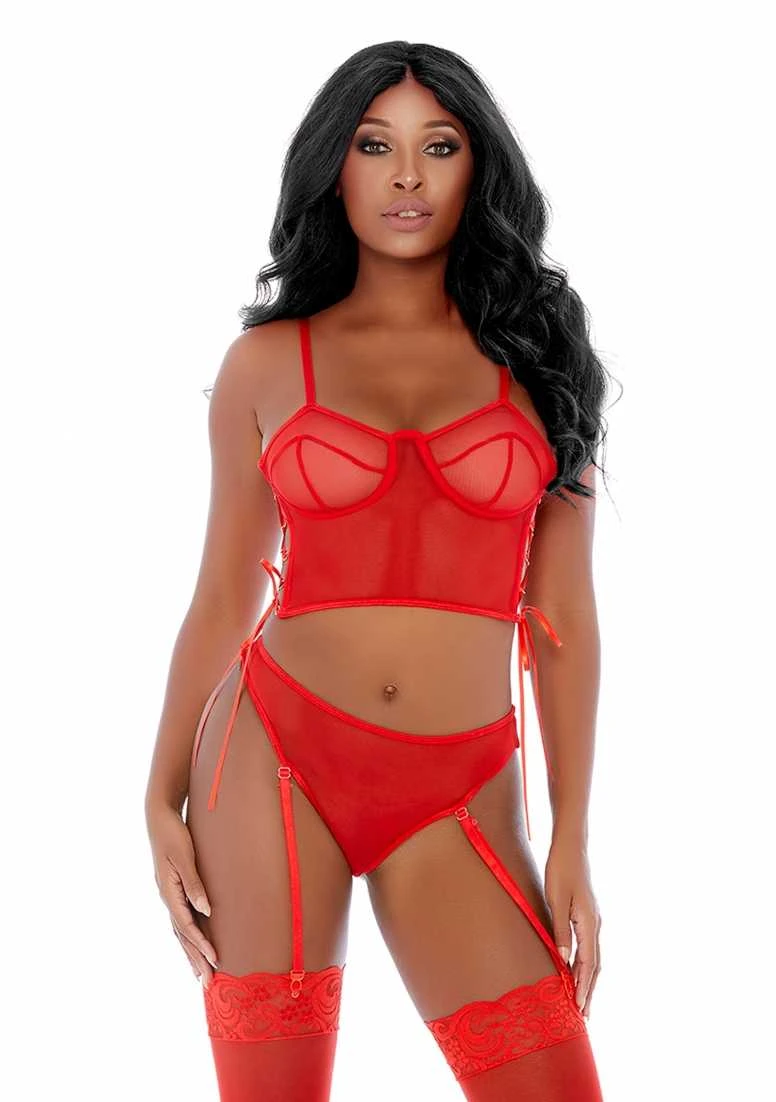 Ring Me Up tweedelige BH set bestaande uit een korte bustier met underwired cups en verstelbare bandjes. De set is voorzien van gouden O-ringen en veter op de zij. De set komt met bijpassende slip met jarretel bandjes. Dit product wordt geleverd in een plastic zakje.