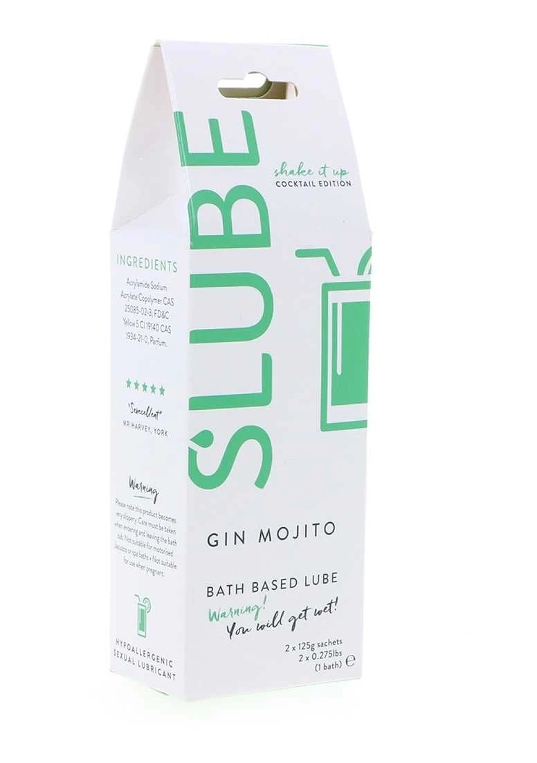 Slube – The cleanest way to get dirty! Mix. Use. Dilute. Drain. Slip slide and slather your partner in the silky smooth sensations of Slube! Immerse yourself into an explosion of fragrance and colour with the Cocktail Editions indulge in a pool of luxurious lubricant with Pure or take a wild ride with the hardcore Black Leather version!Whether you use Slube as a sexy massage gel chill and relax in your bathtub of delight or take things up a notch by getting down and dirty youll never look at your bathtub in the same way again!Slube is a lubricant which comes in the form of crystals. When added to warm water the crystals break down forming an incredibly smooth and sensual body lubricant.You can use Slube for everything from a relaxing bathtub experience to sexy massages!Slube coats the skin completely reducing the need for reapplication and reduces friction between you and your partner. Because of this it leaves the skin feeling soft and refreshed.Slube also holds on to the heat in the water. We have known it to stay warm for up to 2 and a half hours! Plenty of time to play and no need to keep topping up with warm water. Using Slube in the bathtubUsing Slube is easy! Fill up your bathtub as per the included instructions sprinkle the Slube crystals over the water and watch as the Slubey sensations begin to form right in front of your eyes!Once youre done simply add more water to dilute it and then pull the plug. Then as your Slube disappears down the drain wave a tearful goodbye… until next time of course! Using Slube in other waysYou can use Slube in other ways too! We suggest adding a few spoonfuls to warm water in a plastic water bottle. Then just shake the bottle and within minutes your coloured scented lubricant is ready to use!You can also mix it up in a bowl for example if you are using it for massage. Again just a few spoonfuls to warm water should be enough.Why not use it in a playpool and have a sexy naked wrestling match? Mix it up in a bucket and pour it in!Want a thicker consistency? Just add more Slube! Need it to be thinner? Add more water! Its great to experiment with Slube and get it exactly how you want it. Slube Single Packs include 2 x 125g sachets and an instruction leaflet. This is enough for one whole bathtub or several other smaller mixes depending on how you use Slube. Gin Mojito ? Green colour Gin Mojito scent Non-ToxicHypo-AllergenicInternal SafeFood Grade ColoursDegradableNot EdibleVegan Friendly