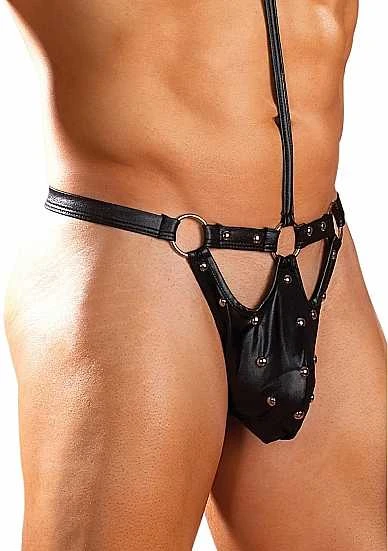 Tormentor – Eendelige Choker G-String met Contour Peek-a-Boo Zakje – S/M – Tormentor features one piece choker g-string with contour peek-a-boo panel pouch, ringed cire waistband with center attached t-strap choker with velcro closure, decorative studs and g-string back.