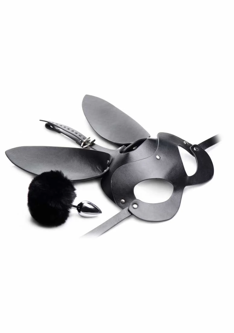 Black rabbit back alley… keep your owner or plaything on their toes with this unique set of sensual accessories! Are you a precious pet or a wild animal? Slip into this ravishing rabbit mask and slide the butt plug up your bunny bum for a rapturous romp with your mate or to frolic amongst your frisky friends.The seductive bunny mask will leave an unforgettable impression. Designed with raw sex appeal in mind the ears and cut-outs are flattering and irresistible. The vegan-friendly material may be cruelty-free… but that does not mean you have to be! The nickel-free metal studs and the adjustable strap ensure that it is compatible with most heads and hares.Weighted for comfort the metal plug is smooth tapered and petite so that insertion is easy and enjoyable even for beginners. Your partner will love how cute you look but more than that they will love knowing that your ass is plugged. Tease them until they are overcome with desire! This butt plug is perfect for preparing for anal sex. Use with any lubricant of your choosing and clean with mild soap and warm water.Measurements: Mask is 8.5 inches in width 12.5 inches in height. Vertical head strap adjusts from 6.5 to 10.5 inches in length. Horizontal head strap adjusts from 19.5 to 27.5 inches in circumference. Tail plug is 4.8 inches in total length. Plug is 3.25 inches total length 2.6 inches insertable 1 inch at widest diameter.